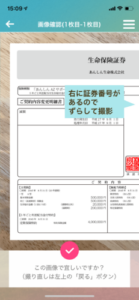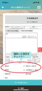 「ご希望の診断」、「保険会社を選択」、「担当者について」の3項目を入力いただい後に「写真を撮影」ページで保険証券の撮影をしていただきます。保険証券が手元にない方は”あとで撮影”を選択して他の項目の入力を進めることも可能です。入力した箇所まで内容がアプリ内に保存されますので、保険証券が手元にご用意でき次第いつでもアンケート入力を再開いただけます。