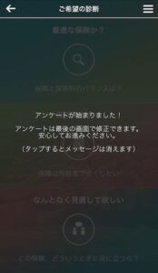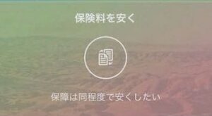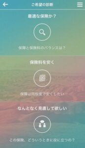 このページから保険診断に必要となる情報のアンケート入力がはじまります。本アプリではユーザー様のご希望に応えるために「最適な保険か?」、「保険料を安く」、「なんとなく見直して欲しい」という3つの診断メニューをご用意しています。