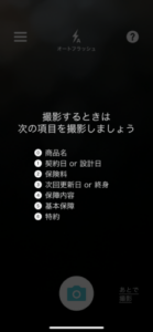 「ご希望の診断」、「保険会社を選択」、「担当者について」の3項目を入力いただい後に「写真を撮影」ページで保険証券の撮影をしていただきます。保険証券が手元にない方は”あとで撮影”を選択して他の項目の入力を進めることも可能です。入力した箇所まで内容がアプリ内に保存されますので、保険証券が手元にご用意でき次第いつでもアンケート入力を再開いただけます。